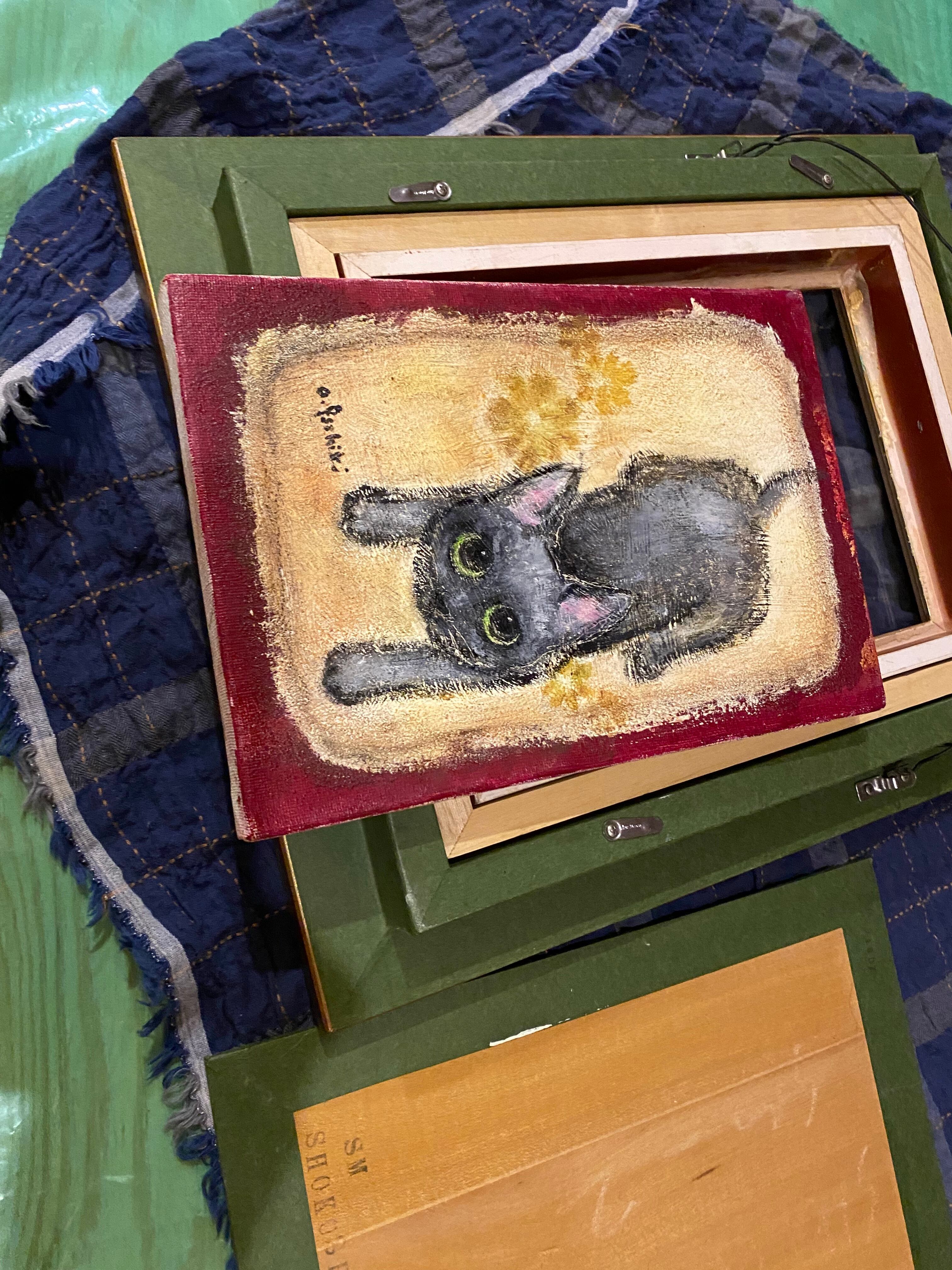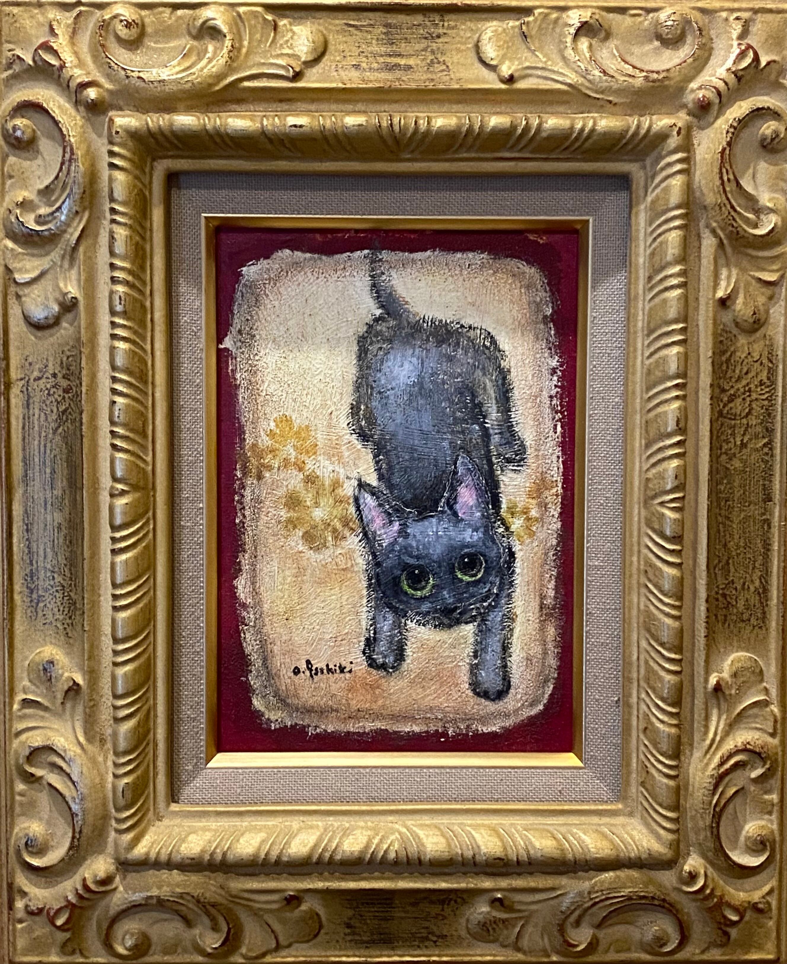 作品タイトル【ねこ】 油彩の深みのある赤で内側を表現しました。猫のまなざしを通して自分の存在を感じていただければと思って描きました。 サイズ・額外枠 縦40cm×横33cm 厚み6cm 額縁は新品ではございません。絵画と共に時を経てきた現状のものを一緒におつけしております。
